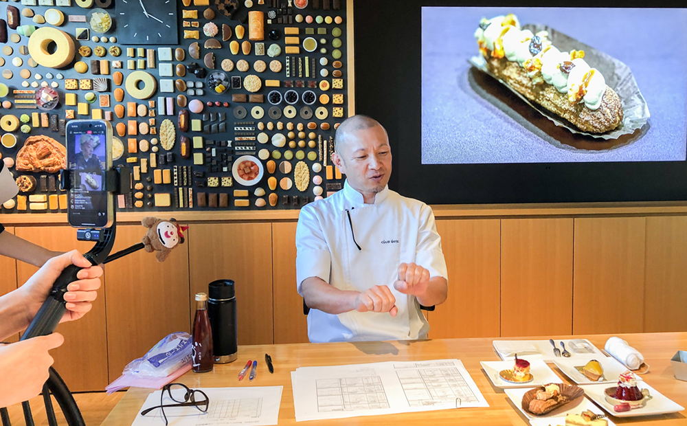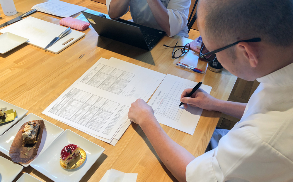 見た目、味はそのままデザイン性やおいしさを、テーマ性は今回の「秋のケーキ」にならった秋らしさ、レシピ内容は分かりやすい表記になっているか、原価計算がしっかりできているか、セールストークは魅力的なものになっているか、などを評価します。