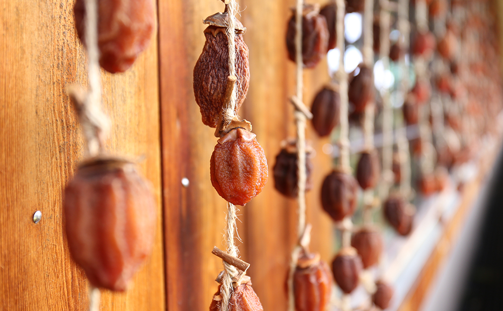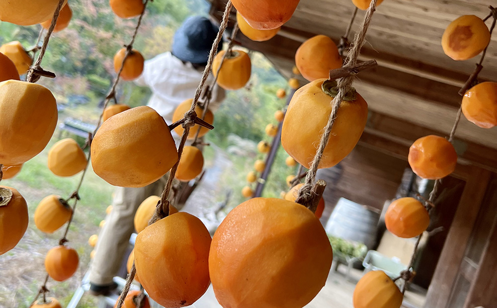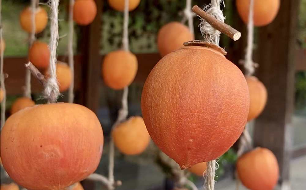 太陽の光をたっぷり浴びて干されることで甘さや旨味を隠してしまっている強い渋み(タンニン)が抜け、私たちが食べられるおいしい干し柿になります。