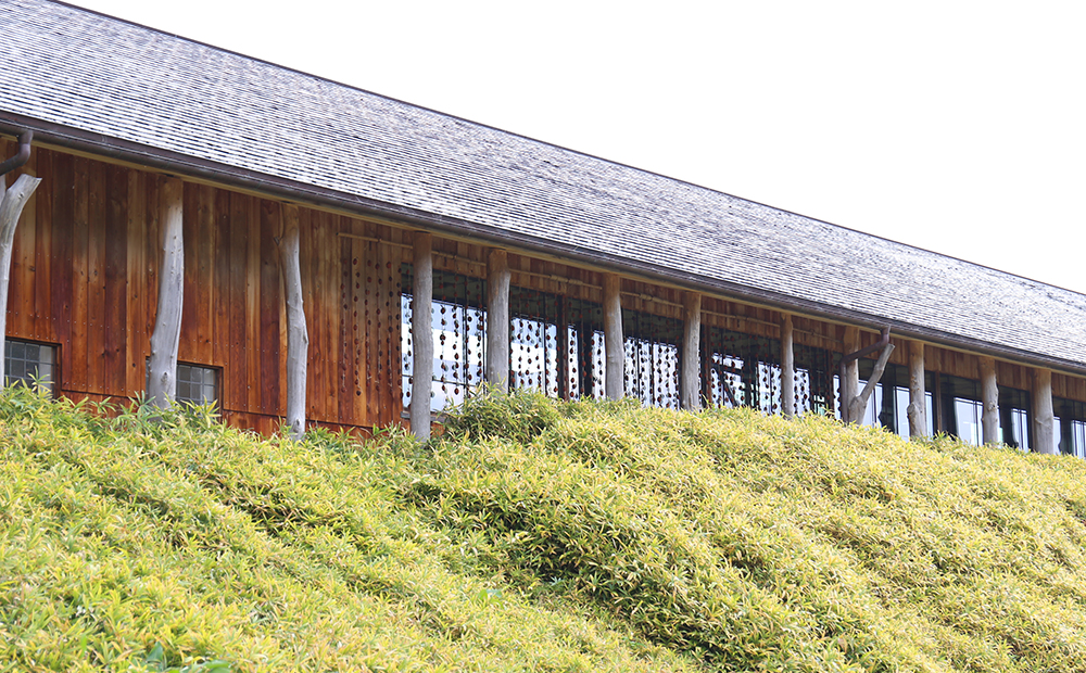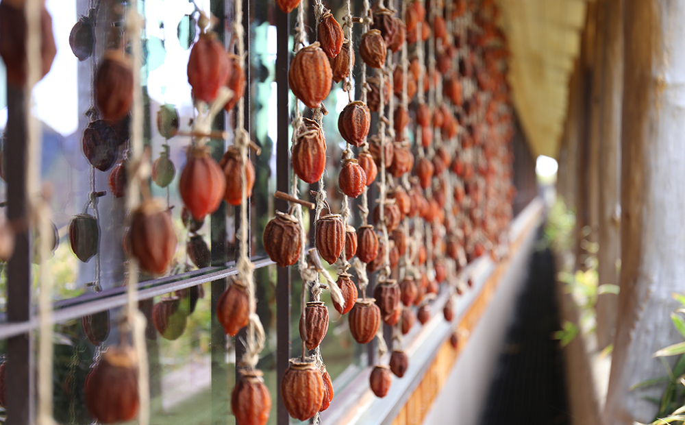 来てくださったお客様に今の季節を感じていただきたいという想いで、少し遠くになりますが、ラ コリーナ近江八幡内 たねやグループ本社のバームファクトリー側の窓辺に干し柿を連ねて展示しています。