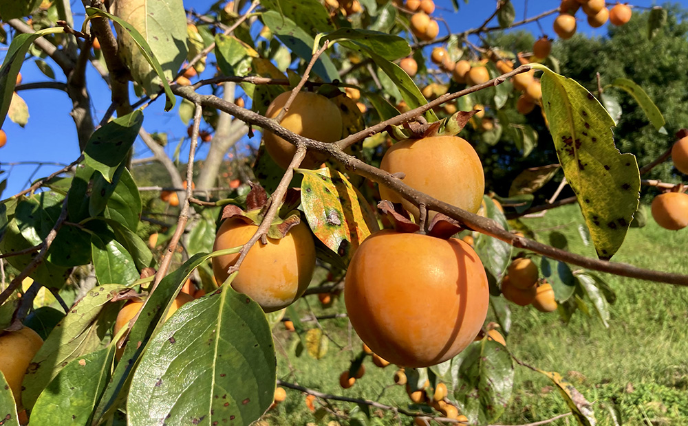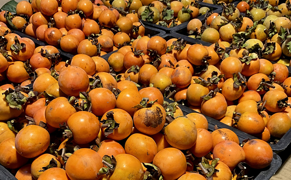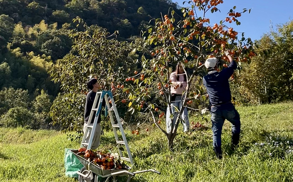 柿を収穫したのは10月末のこと、たねや・クラブハリエの自社農園であるキャンディーファームのスタッフ数名で約800個もの柿を収穫しました。