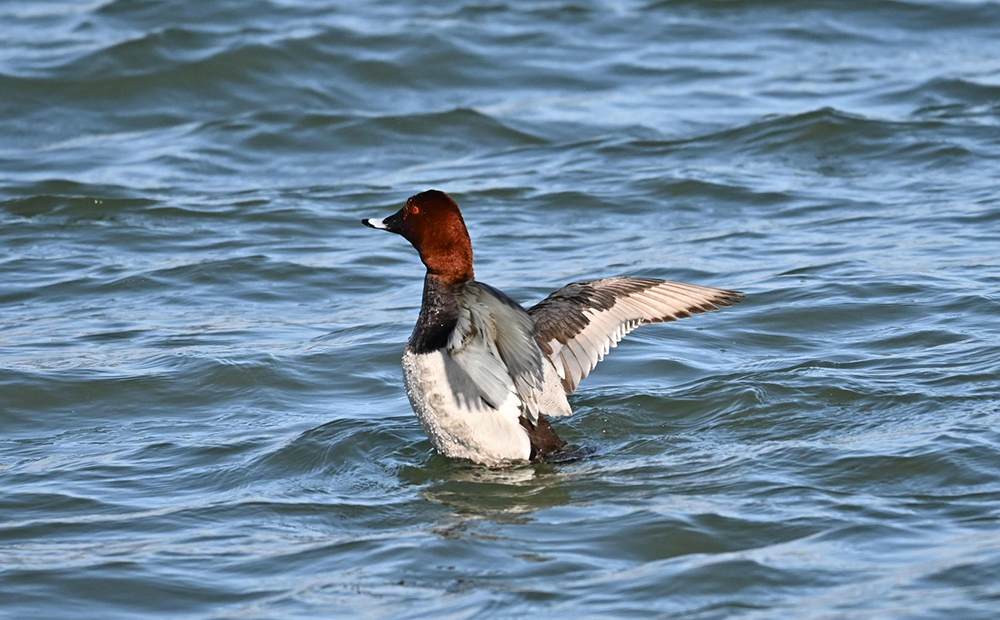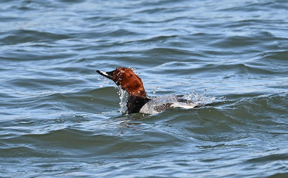 栗色の頭と、真っ赤な眼が特徴的な「ホシハジロ」のオスです。