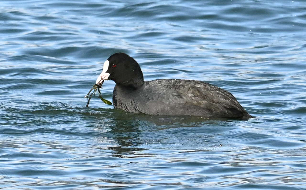 真っ黒な体に、真っ白な嘴(くちばし)と額のコントラストが目を引く「オオバン」です。