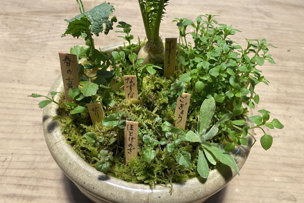 1月7日の人日の節供にいただく七草粥は、春の七草(せり、なずな、ごぎょう、はこべら、ほとけのざ、すずな、すずしろ)を刻みいれたお粥。もとは7種類の穀物を汁物にしていただくことで一年の無病を祈るものでした。