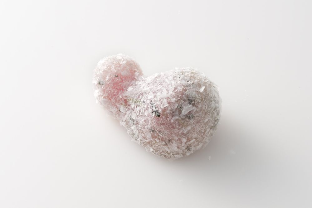 こし餡と薄紅に染めた白餡を七草を刻みいれた道明寺で包み、氷餅をまぶしました。縁起のよい瓢箪の形に仕上げたお菓子を6つそろえ、無病(六瓢)への願いをこめています。