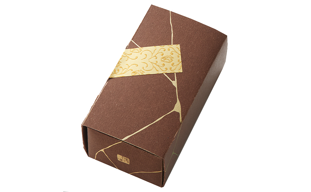 チョコレートをイメージした茶色の箱に「金継ぎ」をイメージしたゴールドのデザインをあしらいました。