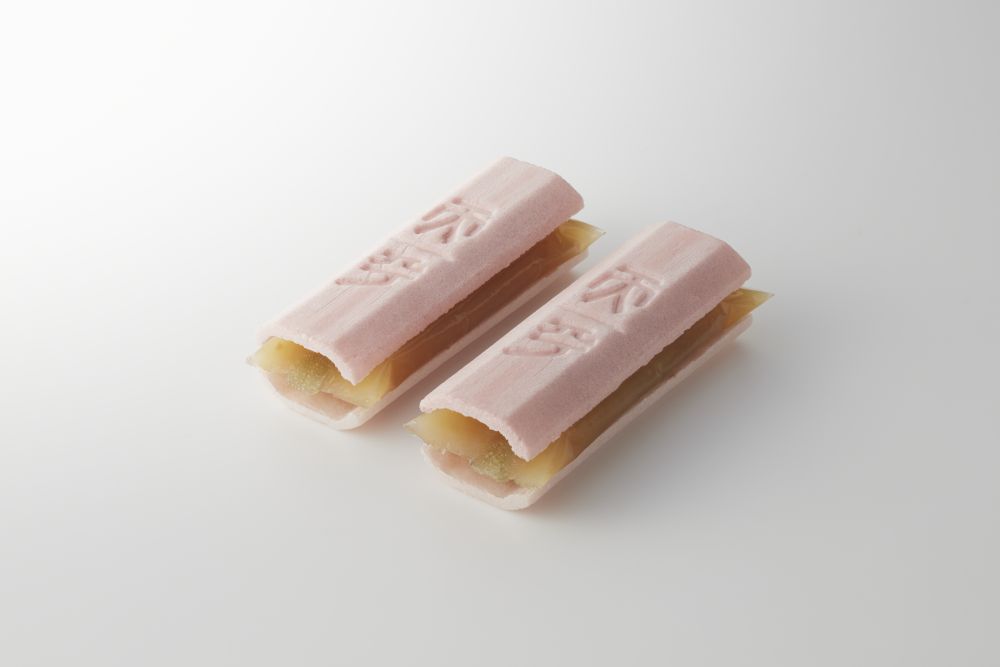 求肥入りの白小豆餡を芳ばしい種にはさんでいただく手づくり最中です。最中種と求肥それぞれに桜の葉パウダーをくわえ、ほのかな香りもお楽しみいただけます。薄桃色と桃色の最中種は、おもてと裏で色がちがう桜の花に見立てたものです。