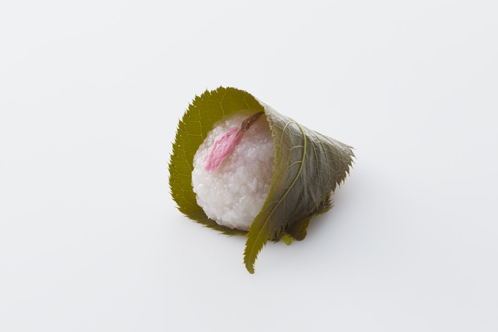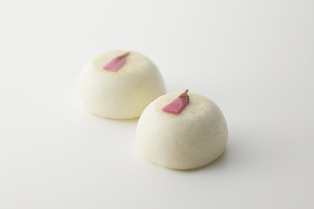 薄紅色に染めた白小豆餡を道明寺で包み、桜の花を添えました。塩漬けした桜の葉もほんのり香る一品です。