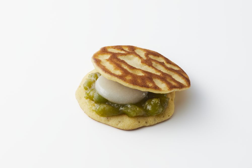とら模様に焼き上げた生地に、北海道産青えんどうをやわらかく炊き上げたうぐいす餡とふくよかなお餅をはさみました。