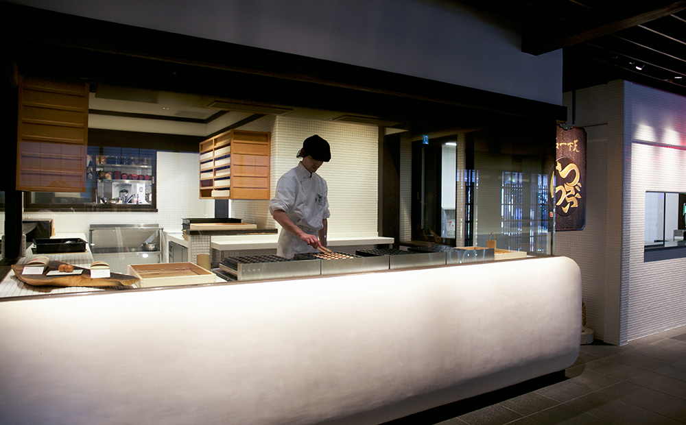 併設された工房の大きなガラス越しに、つぶら餅が次々と焼き上がっていく様子を間近でご覧いただくことができます。