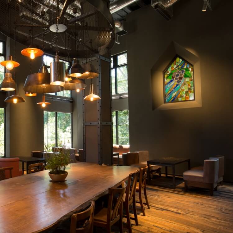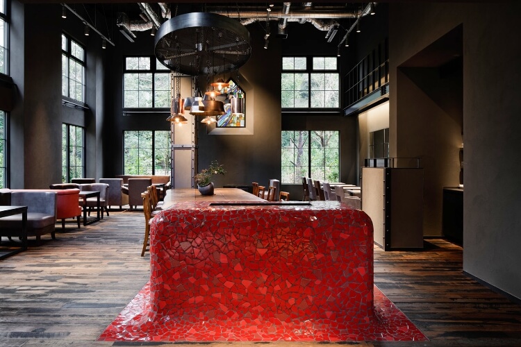 赤いタイルの暖炉が特徴の開放的なカフェ。焼きたてのショコラバームをお楽しみいただけます。