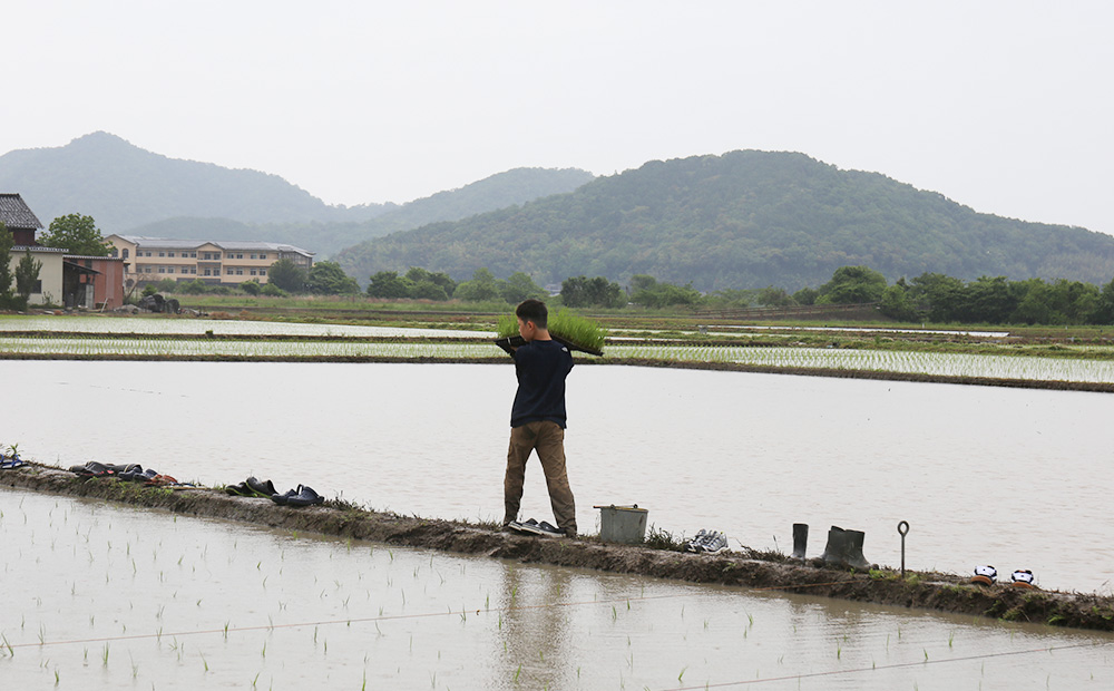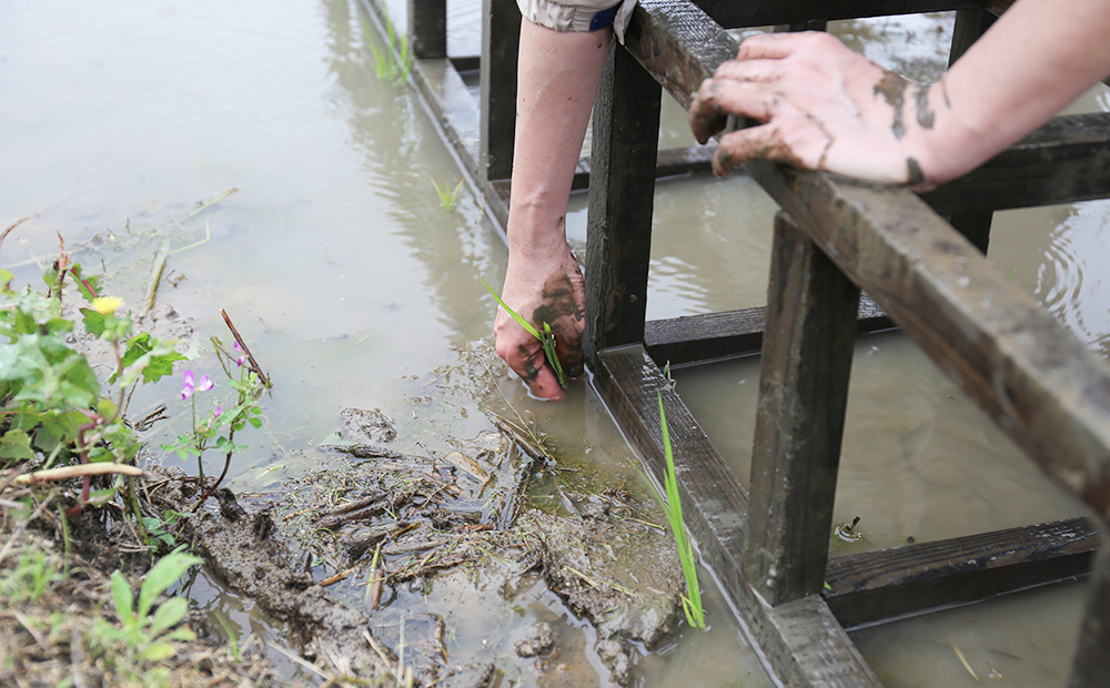たっぷり水を張った田んぼで田植えをすることも雑草対策です。