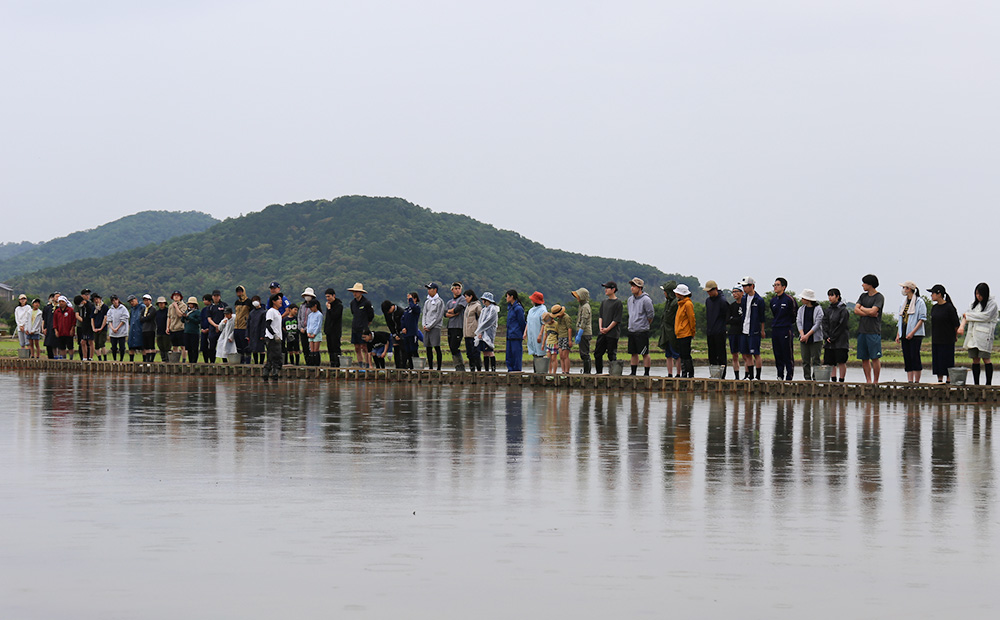 約4,000㎡の田んぼの田植えに参加いただいたのは大学・高校・中学の学生さん、企業団体の方々、たねやグループのスタッフそしてご家族、総勢111名です。