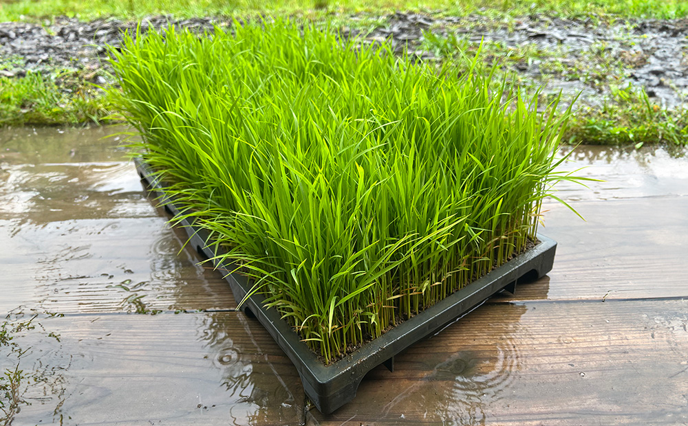 雑草が生えないように、また雑草よりも早く稲が生長するように今年から「ポット苗」での育苗を始めました。