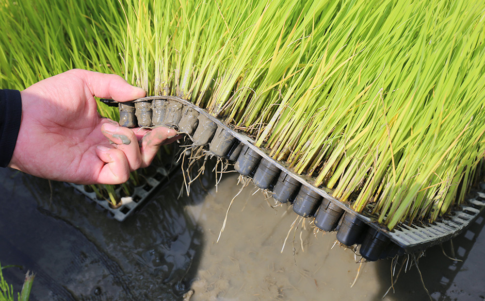 ポット苗は一定の密度で育てられるので根がしっかりと生長します。田植え時にも根を切ることなく植えることができ、田んぼで早く根を張り生長できることが特徴です。