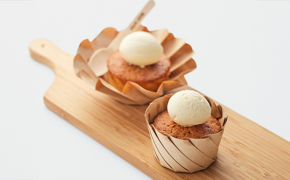 マドレーヌをそのまま食べてもおいしいですし、フレンチトーストのように溶けてしみた部分を食べても。カップは広げることができお皿になるのでパンケーキみたいにひとくちずつ切ってバターを乗せてもいいですね。」