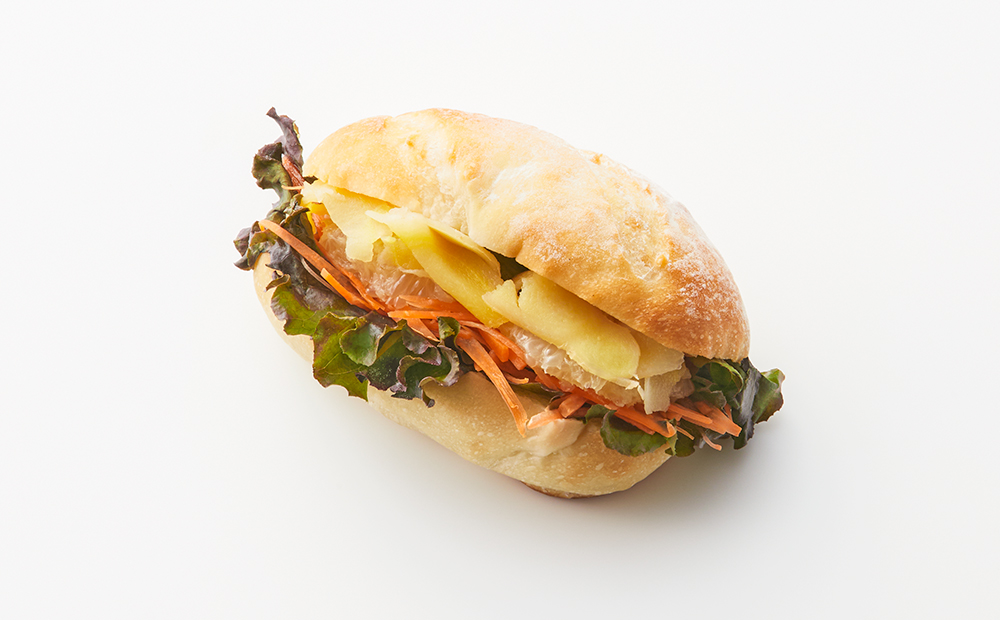 薄切りし湯がき甘酢につけた生姜と、レタス、にんじん、グレープフルーツをもちっとしたパンに挟みマヨネーズでシンプルに味付けしました。お肉を使っていないため、あっさりとお召し上がりいただけます。
