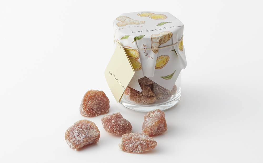 蜜漬けした生姜に砂糖を絡めてじっくりと乾燥させ、外はシャリっと中はしっとりとした食感に。さわやかな生姜の香りやピリッとした辛みを、砂糖のやさしい甘さが包み込みます。