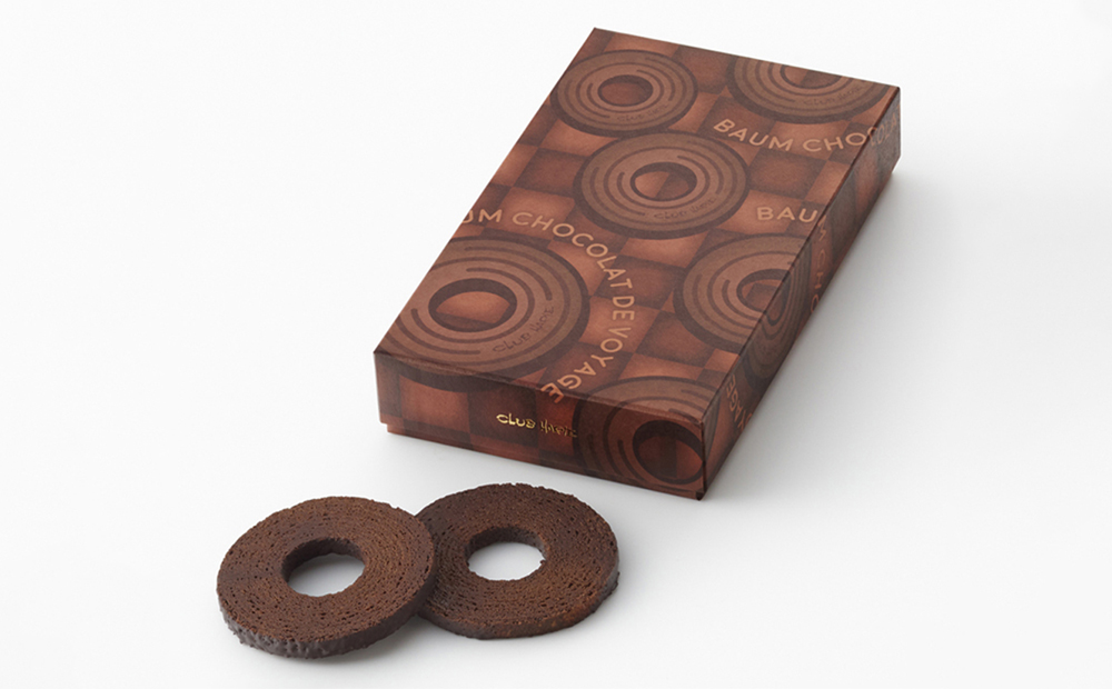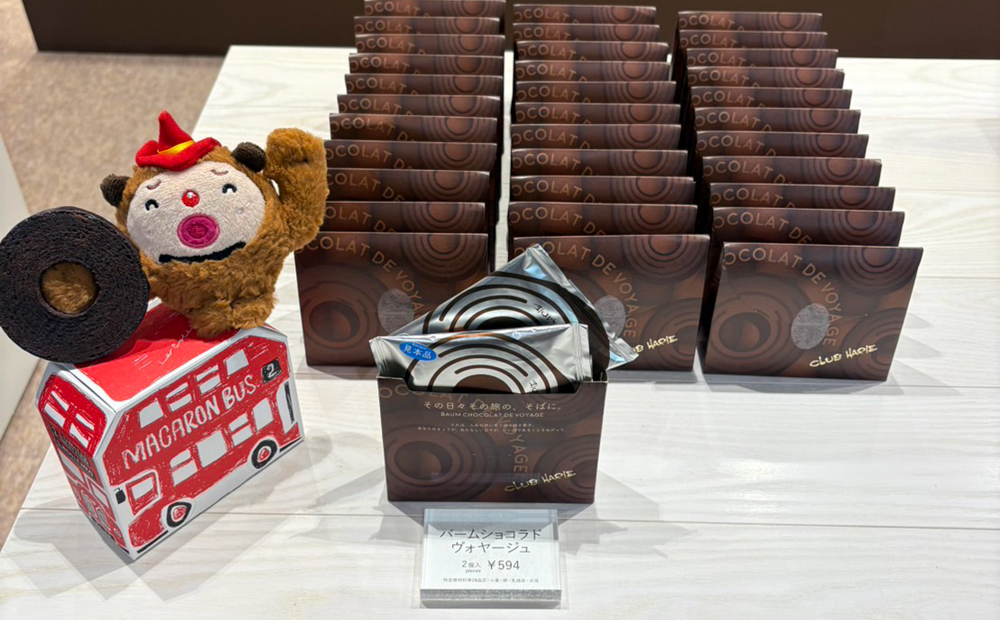 「バームショコラ ド ヴォヤージュ」は、専用のレシピで焼き上げたバームクーヘンを熱風で乾燥させ軽い口あたりにし、数種類のショコラをほどよく染み込ませたクラブハリエの新定番商品です。