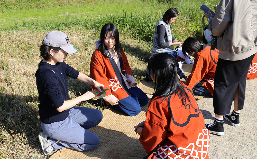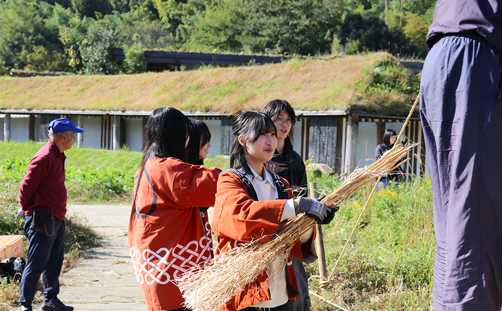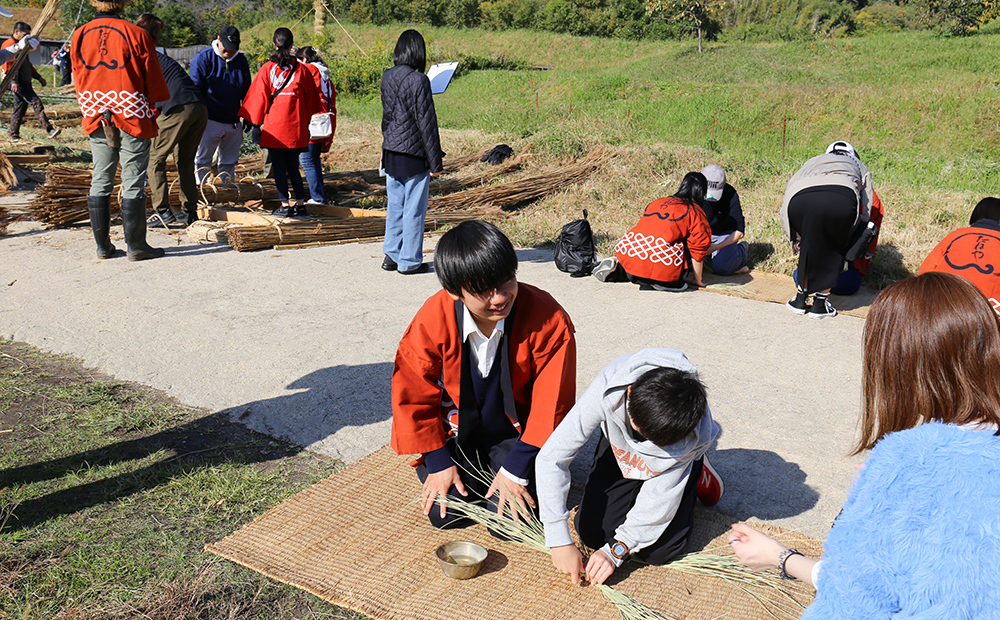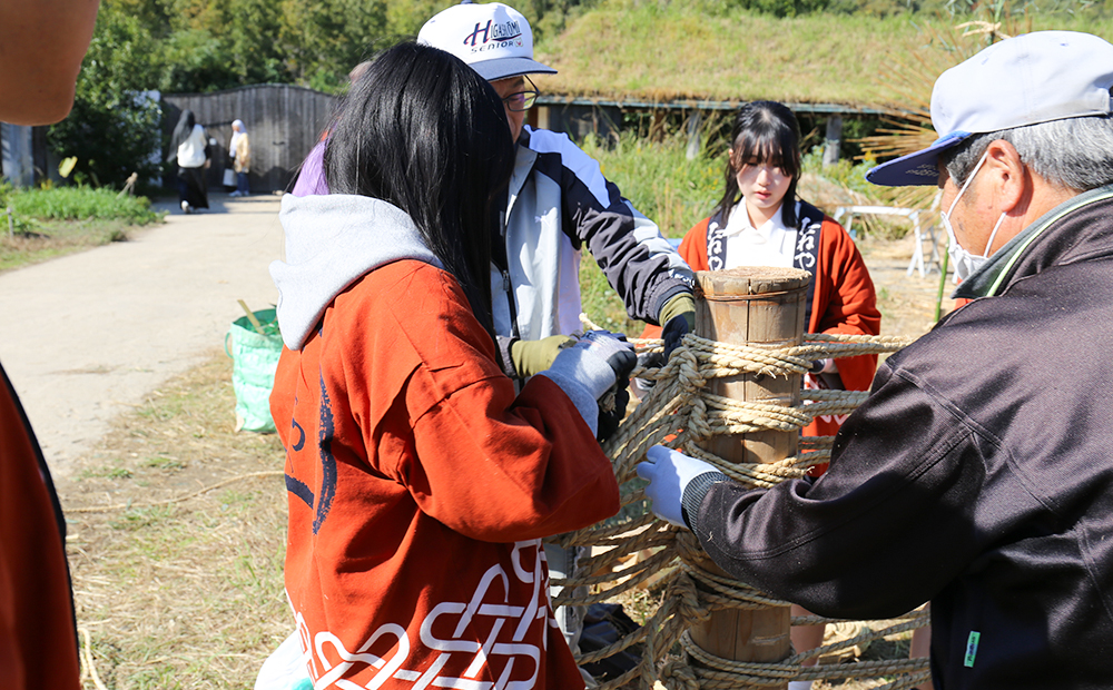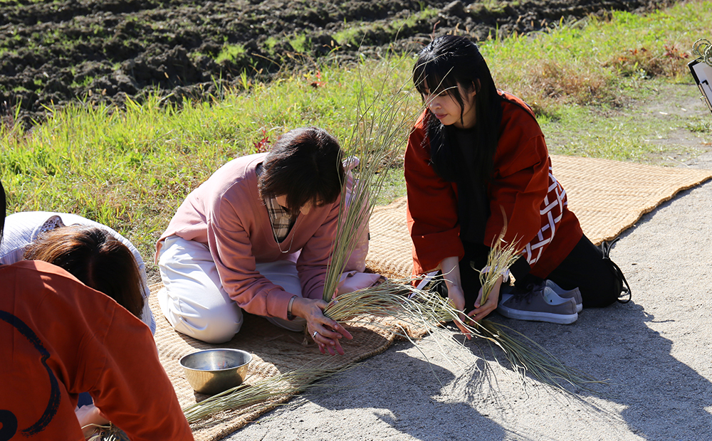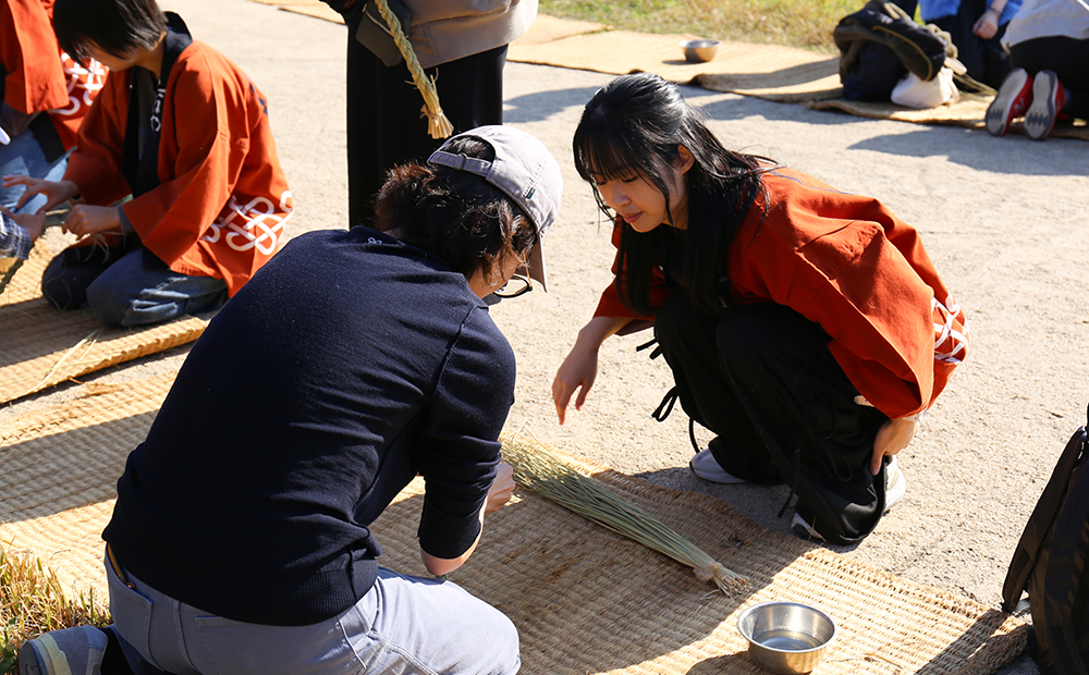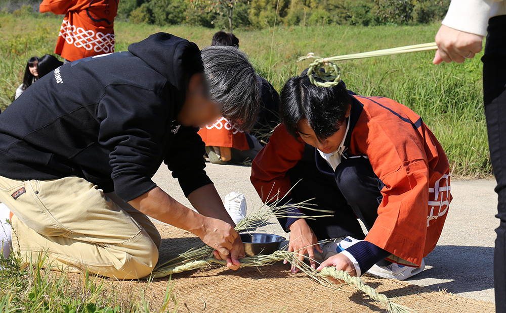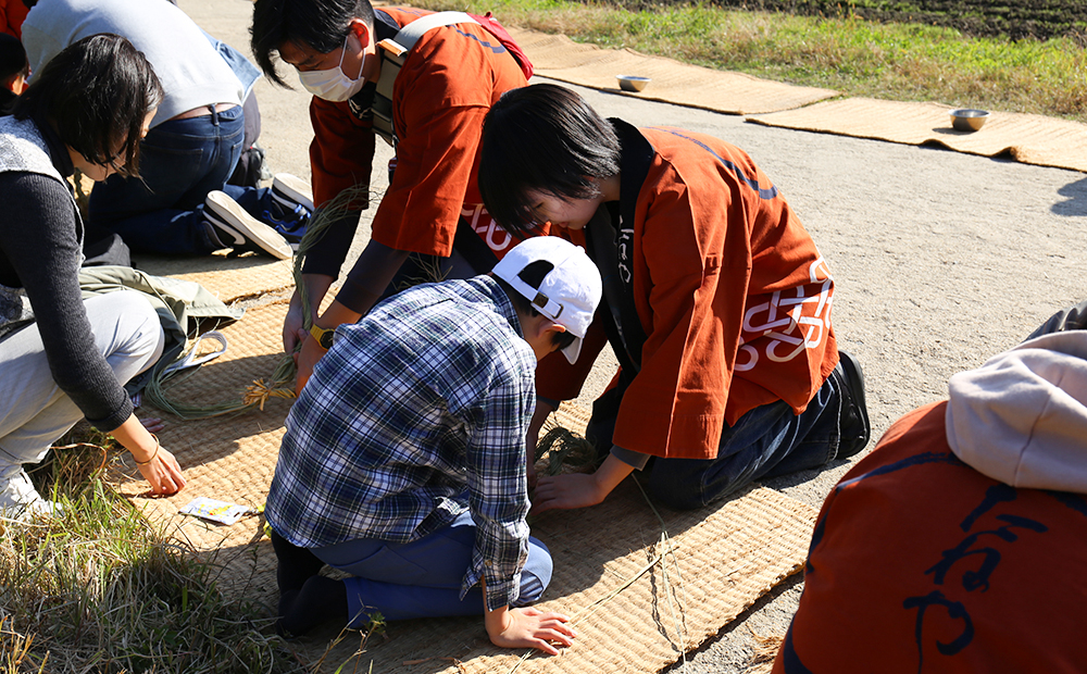 毎年、大きな松明結いの制作にも触れながら、主に学生さんにはお客さま向けの「しめ縄作り」を担当いただいています。