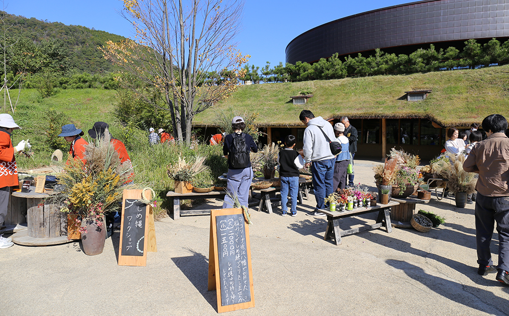 2016年よりラ コリーナ近江八幡の敷地内で行うこのイベントでは、近江八幡市内の各町ごとに 結(ゆ)う大きな松明(たいまつ)制作を間近でご覧いただけるほか、お客さまにもご参加いただけるワークショップのひとつとして「しめ縄作り」を開催しています。
