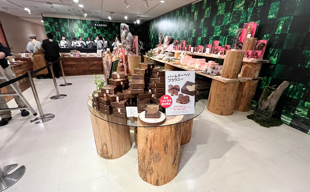 今回のテーマ「切り株職人」に合わせ、本物の切り株を使った特別なディスプレイが広がります。