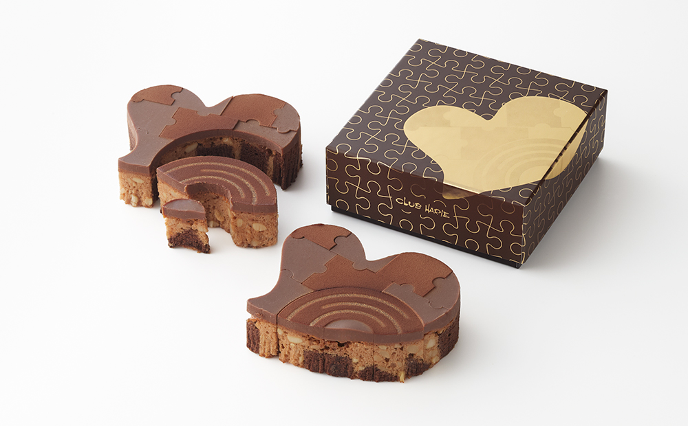 カットしたショコラバーム生地をマカダミアナッツやカシューナッツとともに生地にくわえた特別なハートブラウニー。遊び心が詰まったハート型のパズルにはバームクーヘンを模ったピースも!みんなでシェアしても楽しいですね。
