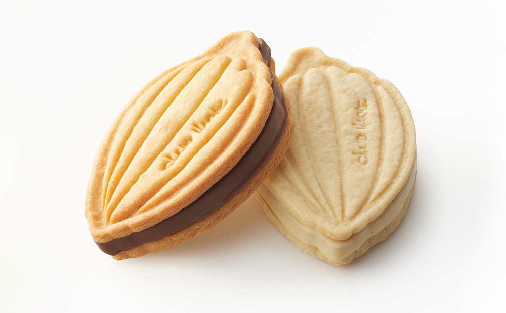 バームクーヘンを使って仕上げたブラウニー生地をチョコレートでコーティング。サクサク軽い食感のサブレでサンドしました。