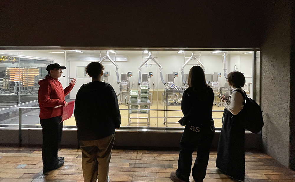 通常業務のかたわら、約2ヶ月のガイド研修を経て、実際にお客さまの前に出るまでに、従業員向けのツアーで経験を積みます。初めてラ コリーナで勤務される方、普段は別の店舗や工場で勤務されている方など、実際のお客様同様イヤホンガイドで聞いていただきます。