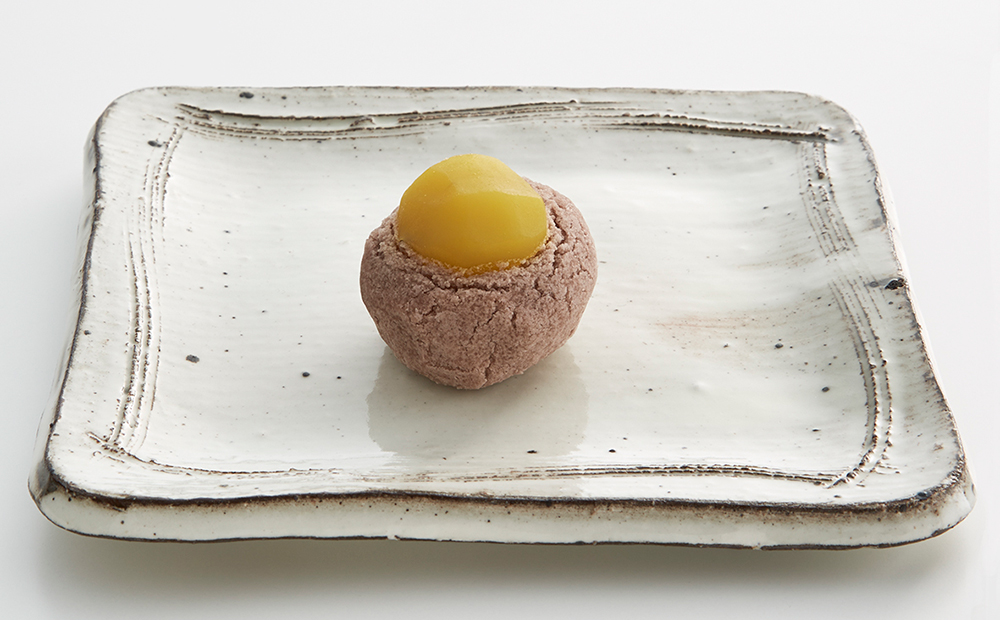 ⼩⾖の時⾬⽣地で⻩味餡を包み、蜜漬けの栗を⼀粒のせ⼗三夜の名⽉をあらわしました。愛らしく仕上げた栗名⽉は、⼝どけのよい時⾬(しぐれ)⽣地と、栗の味、⾷感をお楽しみいただけます。