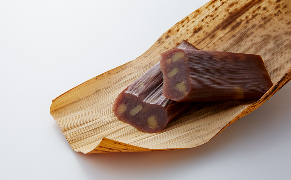 栗の食感もゆたかに、ほのかに広がる竹の香りと栗の素朴な味わいをお楽しみいただける甘さをおさえた蒸羊羹です。