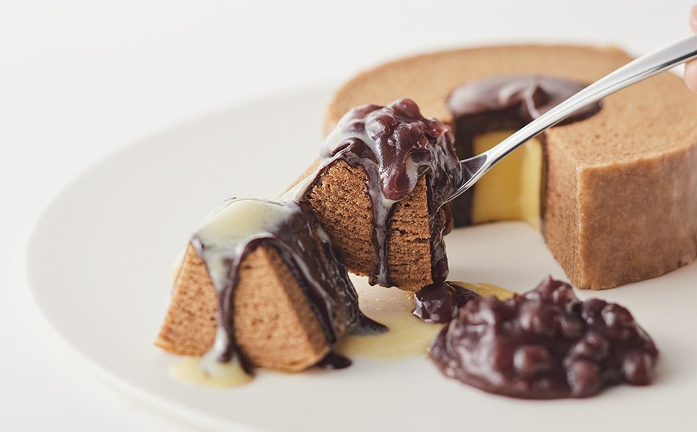 お召しあがりの前にあたためて、仕上げに添えるのは北海道産⼩⾖を使ったなめらかなあんこ。⼀⾒意外な組み合わせながらおいしいハーモニーを奏でます。