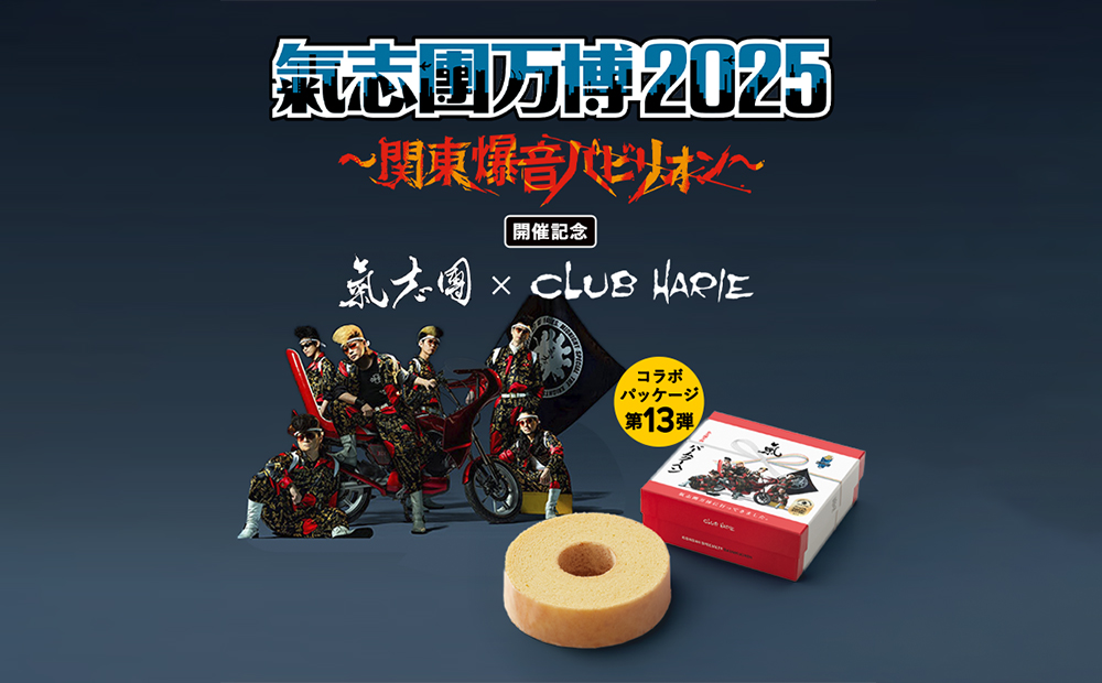 2012年からはじまった氣志團とクラブハリエのコラボレーション、第13弾。幕張メッセ国際展示場で開催される「氣志團万博2025 ~関東爆音パビリオン~」の開催を記念した、「氣志團」と「クラブハリエ」コラボのオリジナルパッケージバームクーヘンです。