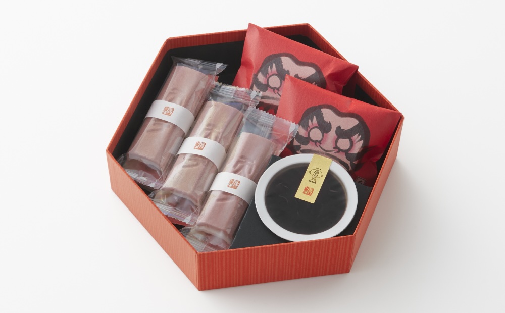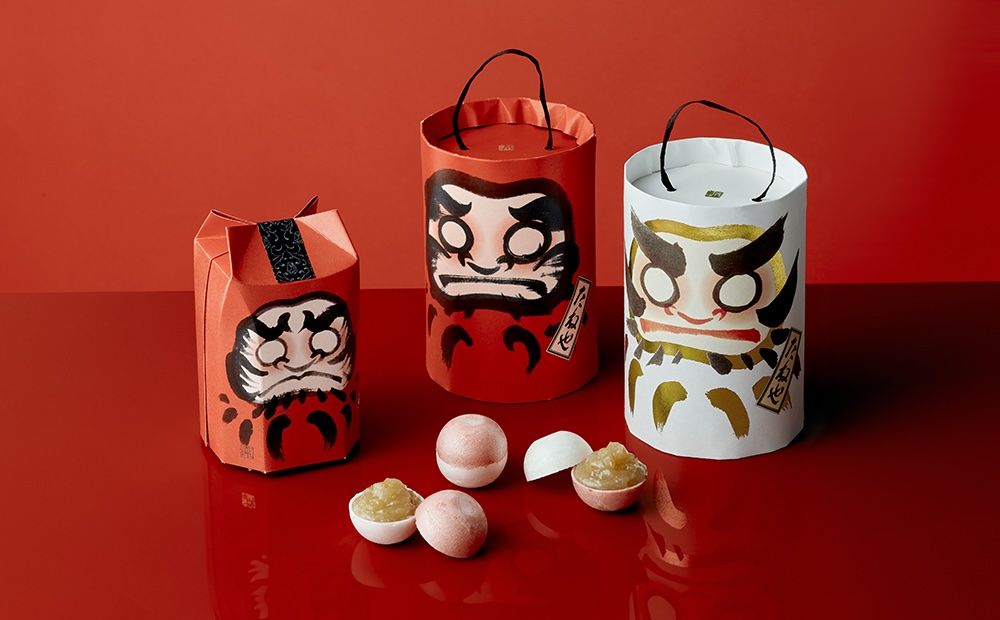 紅白の最中種に福白金時豆の粒餡を挟んでいただく手づくり最中です。暮らしを守り、福を授ける縁起物 達磨さんの意匠に、新しく白い達磨さんが仲間入りしました。