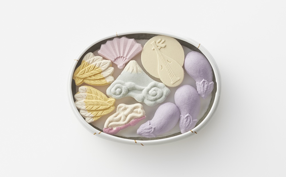 きめ細やかな香川の和三盆糖を使い、熟練の職人の手で縁起物を型取りました。一富士、二鷹、三茄子、四扇、五煙草、六座頭…