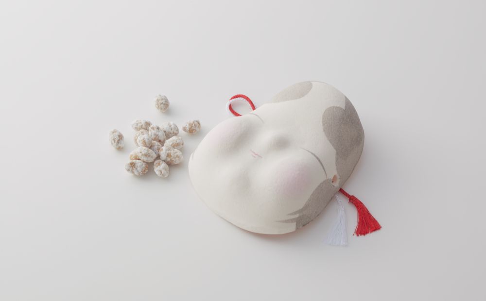 一つひとつ手づくりしたお多福さんの面に、豆本来の旨味や香ばしさを活かし、砂糖をうっすら衣がけした大粒の豆を添えました。