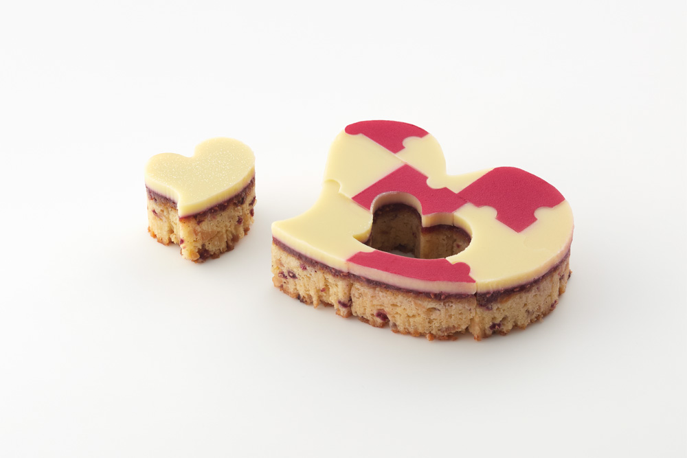 ナッツをくわえしっとり焼き上げたブラウニー生地に、木苺のジャムとまろやかなホワイトチョコレートのガナッシュをかさねました。白と赤の色合いも華やかな一品です。