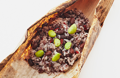 赤米・黒米入りのご飯でゆでたまごを包んだライスコロッケです。トマトやチーズの風味、赤こんにゃくの食感とともにお楽しみください。