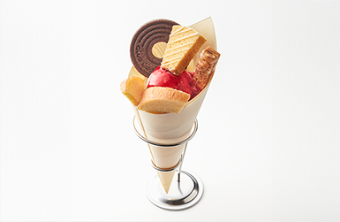 ヨーグルトクリーム・苺ソース・ミルクアイスにバームクーヘンの商品を全部のせたバームクーヘンパフェ。