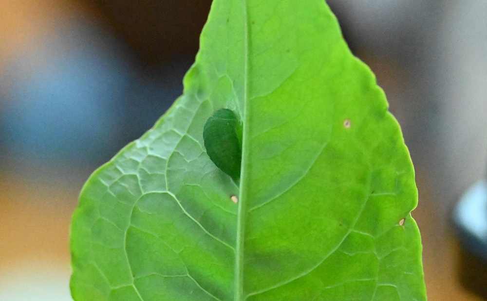 クスノキ科のシロダモという木の苗に、幼虫を見つけました。アオスジアゲハの幼虫は、クスノキ科の葉を食べて育ちます。成虫はそのことをよく分かっていて、シロダモの葉っぱに卵を産んだのですね。ちなみに蝶は脚で味を感じることができ、いろいろな植物の葉に止まって味を確かめて、幼虫が食べる植物に確実に卵を産むことができるのだそうです。