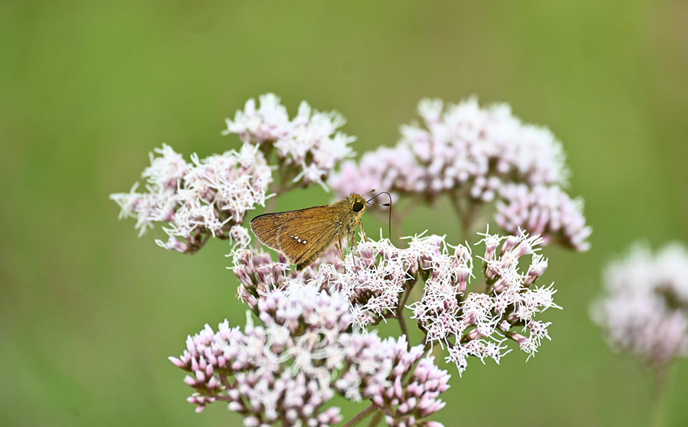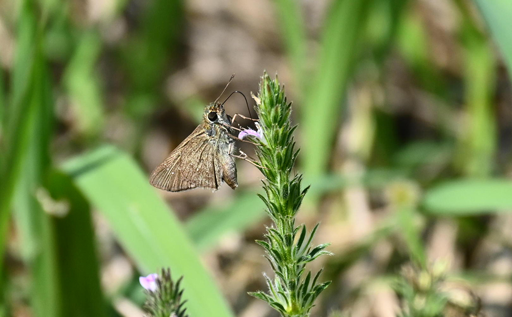 まん丸の大きな眼が特徴的なセセリチョウの一種「チャバネセセリ」です。自分の背丈より高く口吻(こうふん)を伸ばす様子は、まるで一本釣りをしているようにも見えて面白いです。