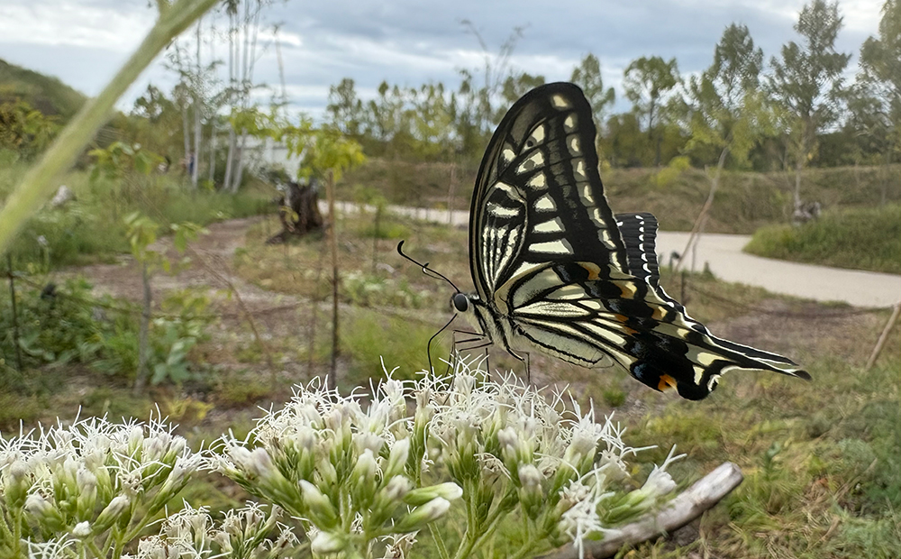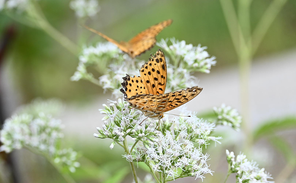「琵琶湖の森」の雑木林エリアに咲く白い花に、たくさんのチョウが集まっています。