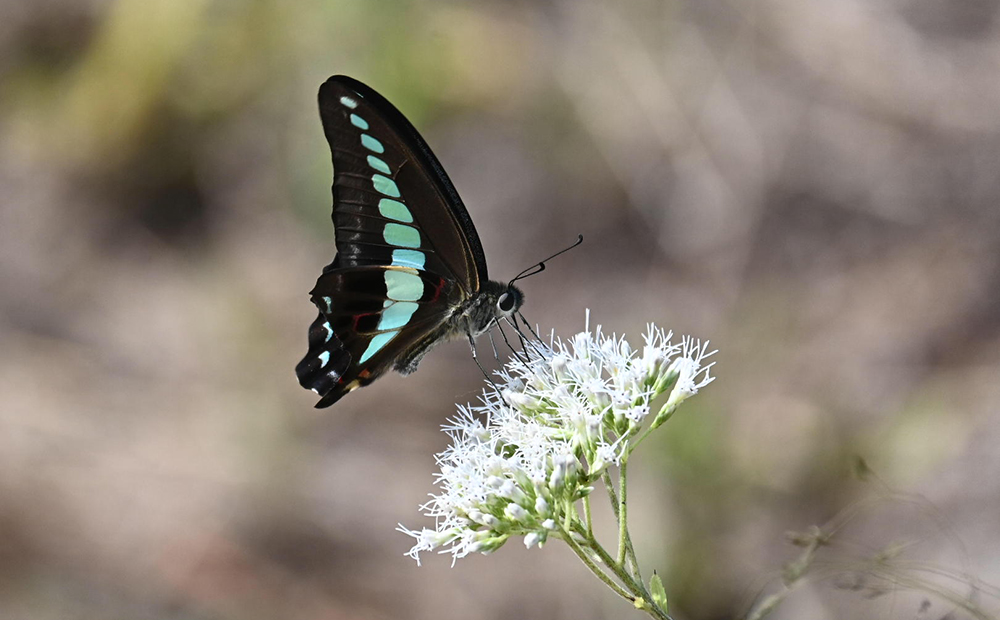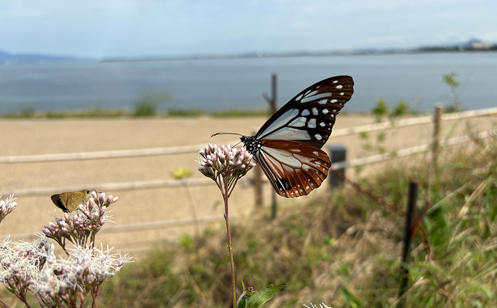作業中に、大きなチョウがふわりふわりと優雅に飛んでいる様子が目に入りました。追いかけてみると、その正体は「アサギマダラ」!「琵琶湖の森」に来てくれたらいいなと、スタッフ同士で話していたところでした。