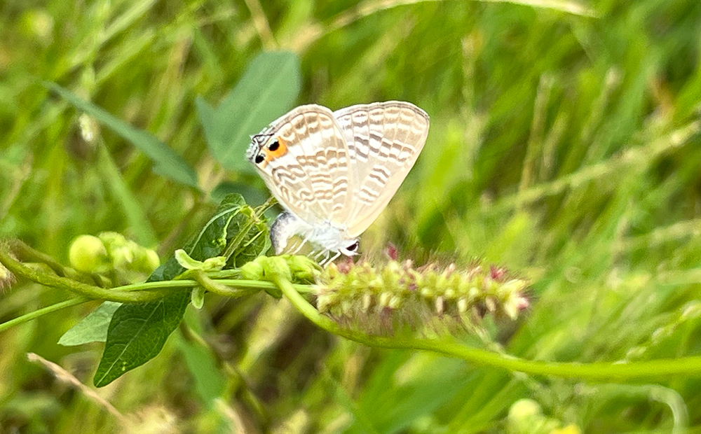 翅(はね)の波模様が特徴的なシジミチョウ、「ウラナミシジミ」です。腹部の先端を植物の蕾にくっつけて、産卵をしています。