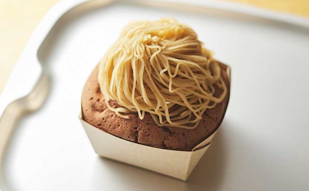 ふんわりと焼き上げた焼きたてのたねやカステラ ショコラに、栗餡と生クリーム、さらに上から栗餡をたっぷりと絞りモンブランに仕上げました。