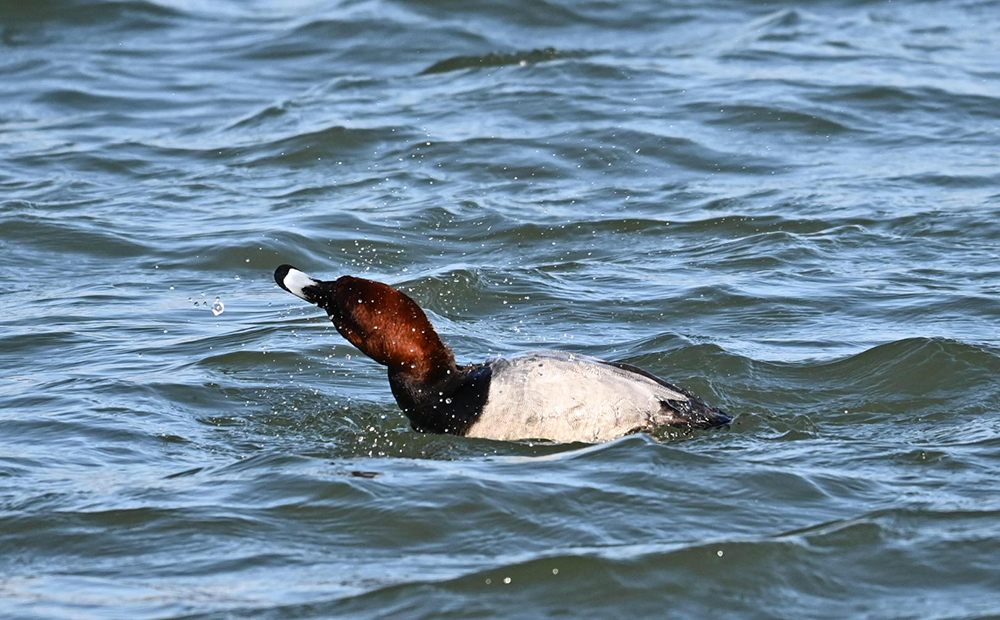 栗色の頭と、真っ赤な眼が特徴的な「ホシハジロ」のオスです。