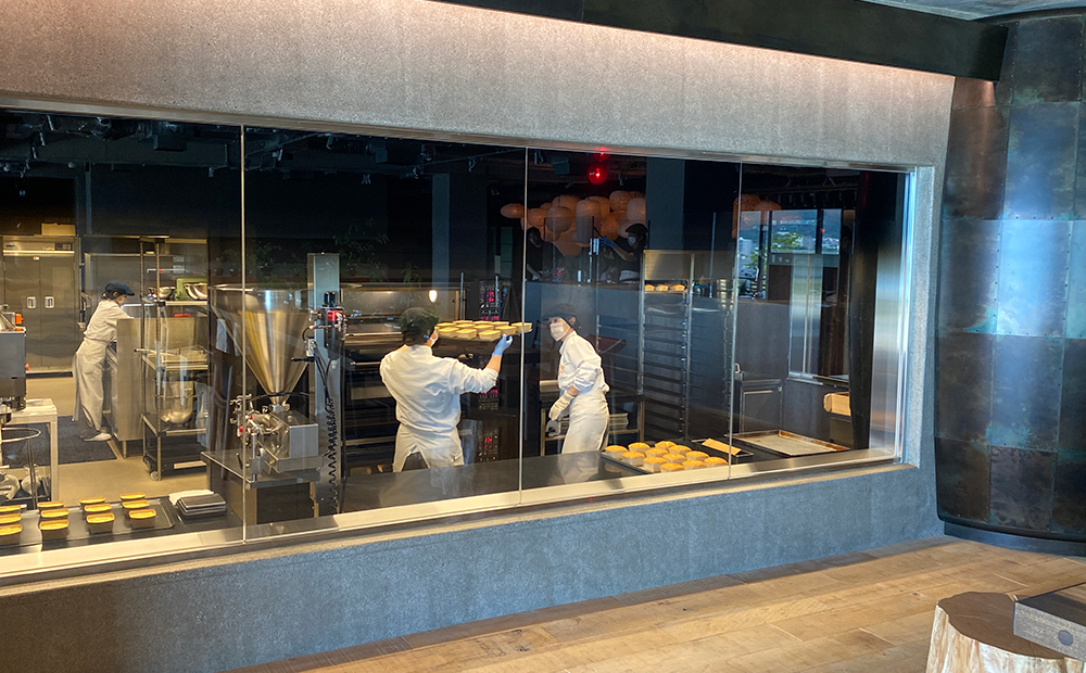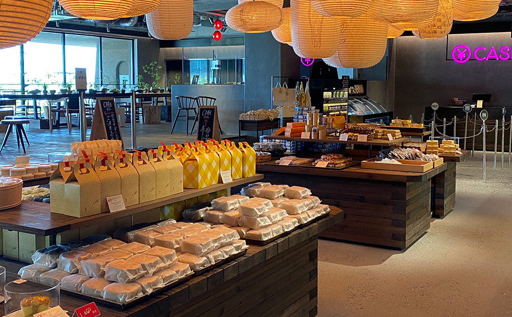 LAGOと言えば限定の焼きたてたねやカステラ。店内にある工房で焼き上げています。CHAYAでお召し上がりいただけるほか、お持ち帰りもご用意しています。