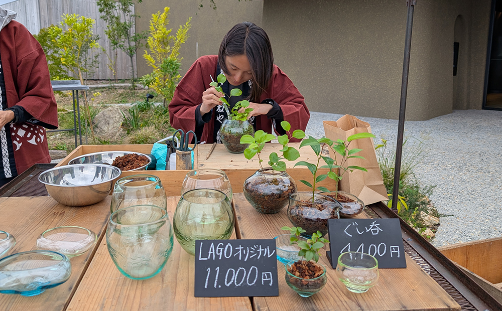 ご購入のお客様には、お好みの琵琶湖彩とLAGO 大津の琵琶湖の森で育てた苗木をお選びいただき、その場でスタッフが寄せ植えを行います。