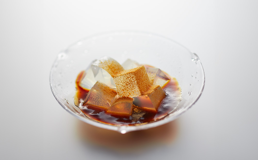 瑞々しくはじけるような食感の寒天に、濃厚な黒蜜ソースと芳ばしいきな粉を合わせてお召し上がりいただく涼菓です。