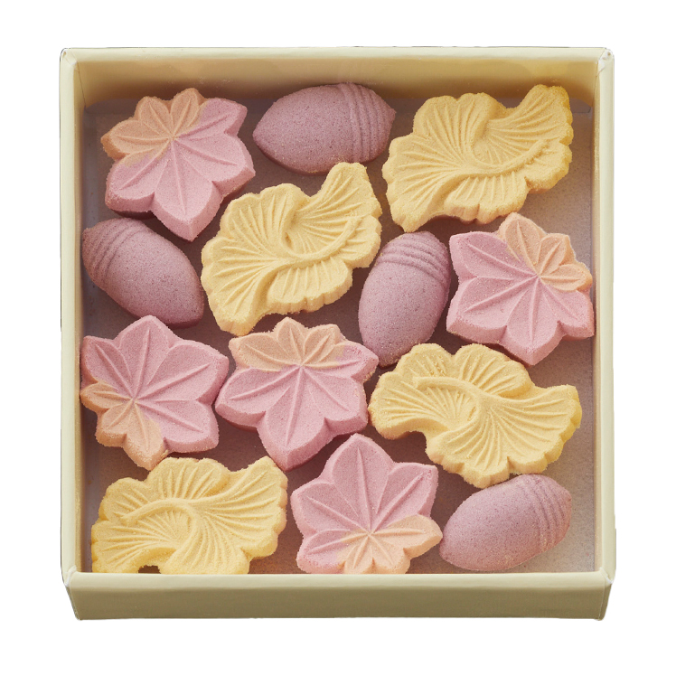 折々の木型によせるお干菓子は、熟練の職人の手によって口どけもほろりとやさしく仕上げました。