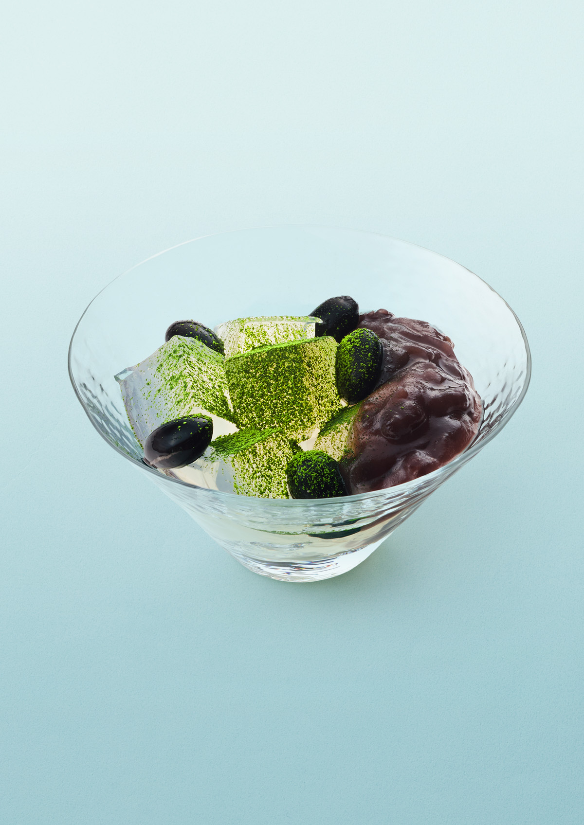 くずれる瞬間のおいしさを追求した寒天はごろっと大きめ。熟練の職人が炊き上げた瑞々しい餡と大粒の黒豆に、滋賀県土山産の抹茶を合わせました。